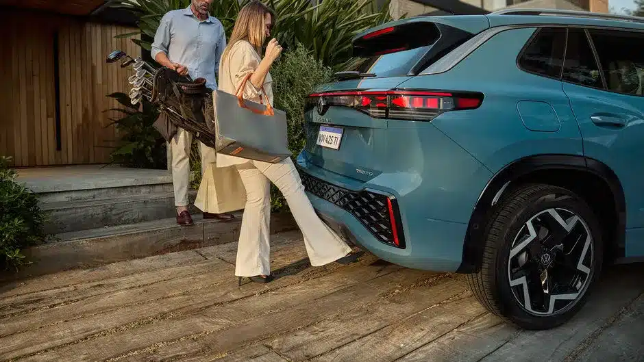 Firma nocturna La parte trasera del Nuevo Tiguan 2025 se destaca por un diseño cómodo, con emblemas Volkswagen iluminados.